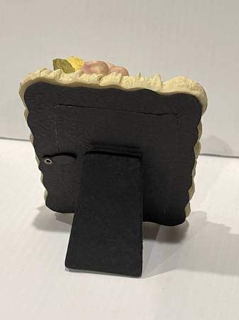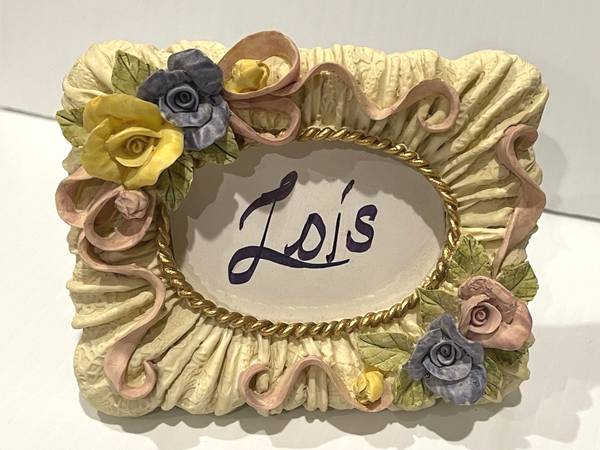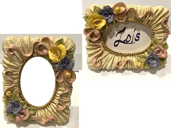 SET OF 3 IVORY CERAMIC FRAMES with pink, purple & yellow rosettes, and light green leaves on “gathered” ivory background that is meant to look like fabric, with a gold rope oval outline bordering around the photo area.