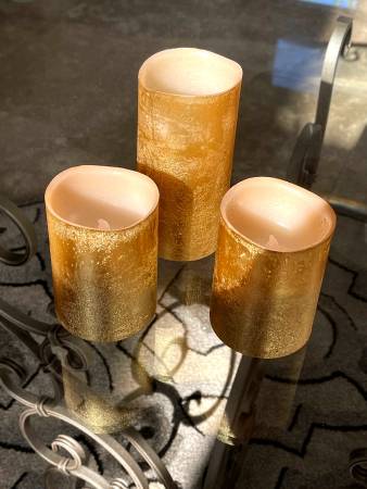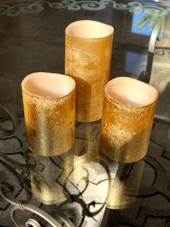 This listing is for a beautiful set of 3 LED candles in a shimmery gold Metallic that looks like foil. They operate for days on a small battery that is easily replaced when needed. There is a tiny on/off switch on the bottom so you an control when you want to use them, but there is also a timer switch on the bottom as well so they will go off automatically after a set amount of hours.