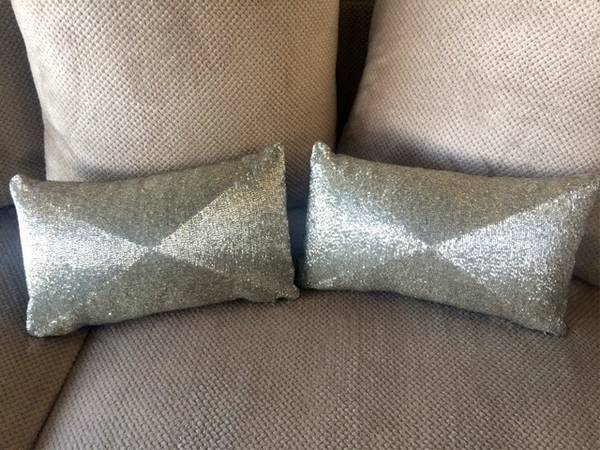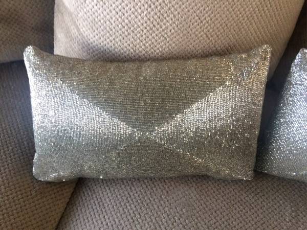 This listing is for the shimmering silver pillow you see if the first two photos. I bought two of them for $49 each but then ended up only needing to use one of them, so I am selling the other one. It is BRAND NEW - Never used...not even for display. Measures 14.5" long X 8" high and has a zipper on the bottom, so you can easily take out the pillow insert and wipe clean the outer fabric. On the back side the pillow is a solid light gray linen fabric. The front side is completely covered in tiny, shimmering silver beads so this really sparkles! It is GORGEOUS and I get so many compliments on mine! It is the perfect size to fit in between the arms of any chair, or use it as a front accent piece on your bed or sofa.
