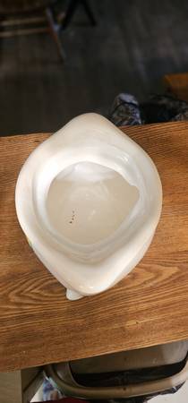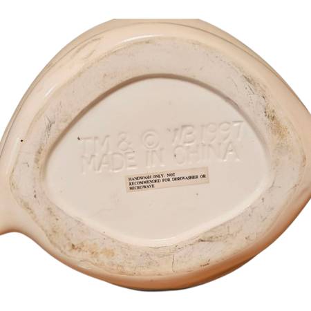 Utensil Holder: 1996 Chef Tweety Bird ceramic utensil holder features Tweety Bird wearing a chef's hat and holding a bowl, with a flour bag behind him. It was produced by Warner Bros. Studio Stores. The item is often described as a flour bag or a baking-themed kitchen utensil holder.