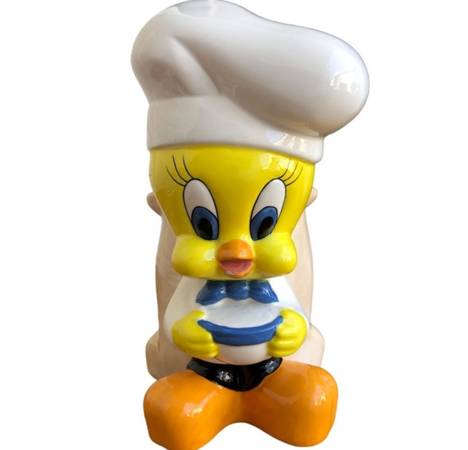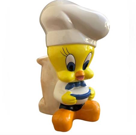 The items in the image are a vintage Tweety Bird cookie jar and a utensil holder, both featuring the character as a chef.