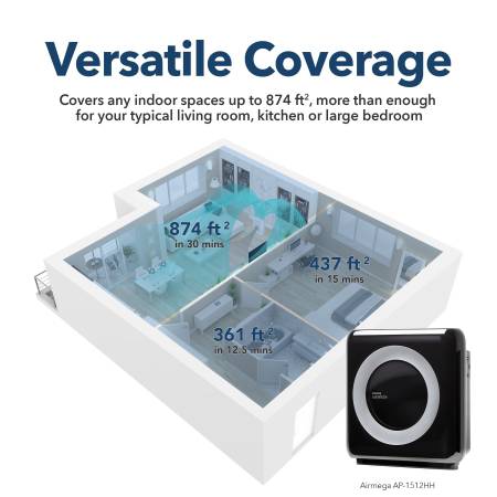 NEW $190+TAX Specifications Room Coverage 1 air change/hr.* 1,748 ft² (162 m²) 2 air changes/hr.* 874 ft² (81 m²) 4.8 air changes/hr.*** 361 ft² (34 m²) 5 CADR (Clean Air Delivery Rate) 234 (Smoke),...