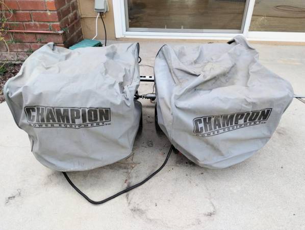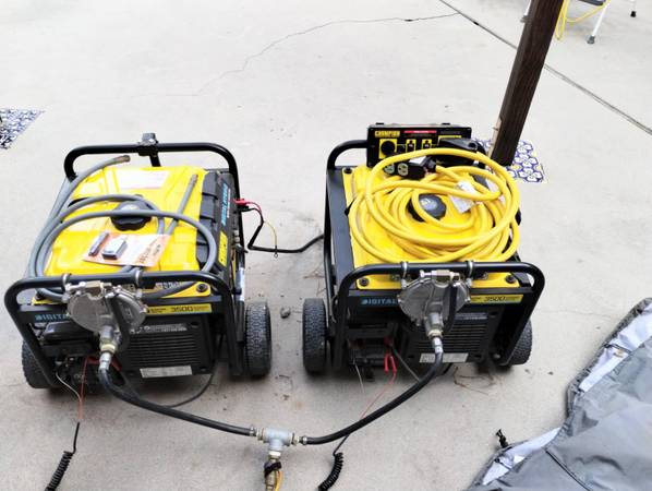 2 Champion Digital Hybrid 3500 watt generator-inverters with remotes to start them. Model 100573 but customized to also use natural gas. They are linked together to provide 7000 total watts, and run on gasoline, propane, or natural gas. Includes super long hose to connect to natural gas, very long extension cord to plug in appliances, and generator covers. Barely used. Prefer to sell as a set but will separate...$500 for 1, $1000 for both.