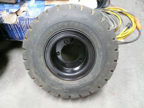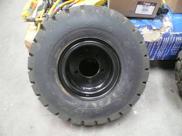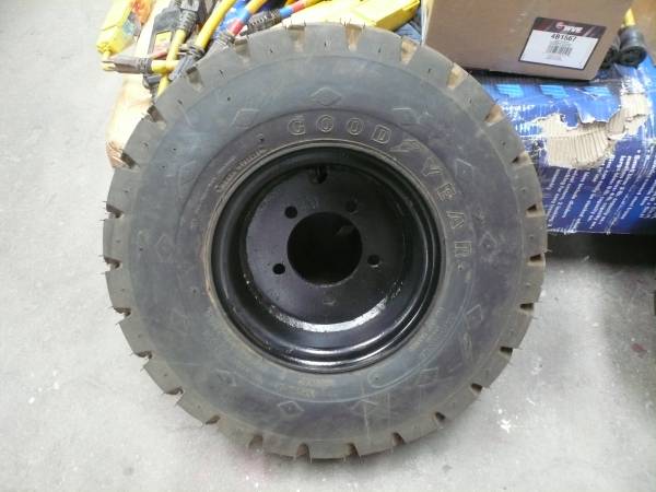 Pair of Goodyear 10 ply pneumatic forklift tires with 5 lug wheels for sale. Bolt pattern is 5 x 5.25 (measured diagonally lug center to lug center). Center hole is 4". Both tires have been mounted to the wheels but have not been mounted to a forklift, other piece of equipment or driven on. These are two different sized wheels. One for the front and a rear for one side of a machine only.