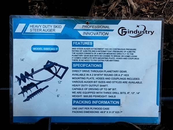New Heavy Duty Hydraulic Auger Attachment with 3 Bits (6", 12", 14") Mfg: AGT Model: SSECAG-Y Pressure Rating: 3,000 PSI Recommended Flow Rate: 12-16 GPM Overall Length: 80" Weight: 500LBS Drill...