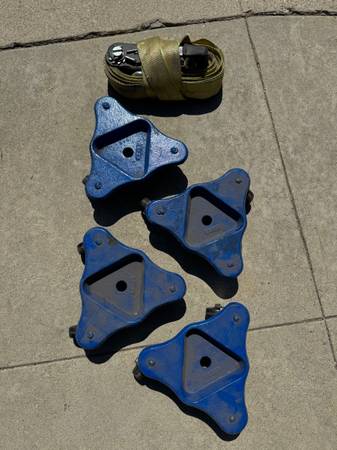 4-INDUSTRIAL TRI WHEEL CUP DOLLYS-840lb EACH CAPACITY + 10,000lb RATCHET STRAP - All in excellent condition and strong enough to support a car. Brand new sells for well over $600. Asking $370. OBO...
