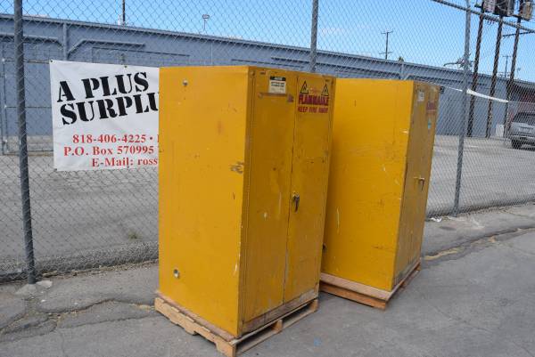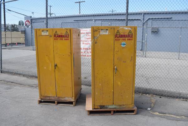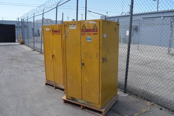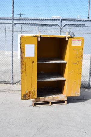 Qty ~ 2 Flammable liquid cabinet 60 gallon 25602 Flammable Storage Cabinet - Standard, Self-Closing Doors, Yellow, 60 Gallon 34 x 34 x 65" 60 gallon 2shelves