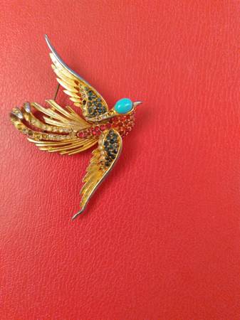 A stunning pre-owned brooch featuring a flying bird design with a vibrant turquoise eye.