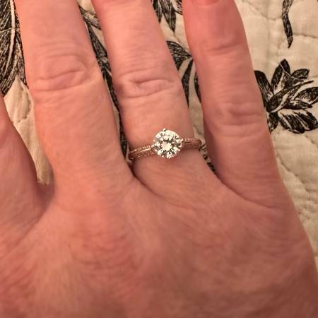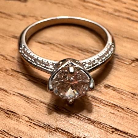 New solitaire engagement style ring. Stainless steel plated in white gold. Size 6. Purchased to wear on vacation (instead of my real wedding ring and potentially losing it), but I didn't end up wearing it.