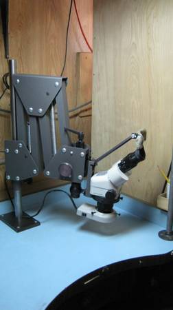 I sell my Meiji EMZ-5 microscope with GRS Acrobat stand with headrest and ring light. Eyepices are 10X and main lens is 0.5X.