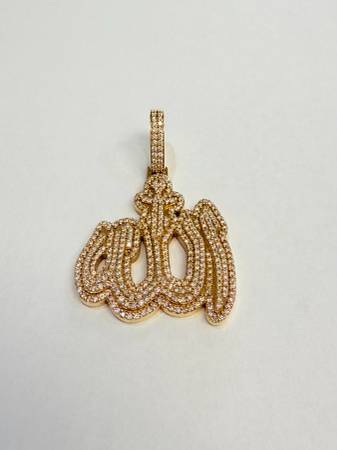 For sale is a stunning “ALLAHU” Arabic pendant crafted in solid 14K gold and fully set with approximately 5–6 carats of diamonds. This is a heavy, solid piece (37 grams) with excellent craftsmanship and brilliant shine.