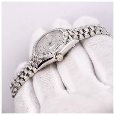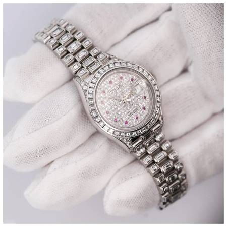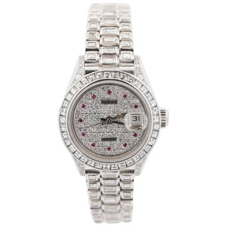 Vintage 1988 Rolex Datejust Presidential in platinum featuring 15 carats of natural diamonds. Pave diamond dial and pink ruby hour markers. Emerald/baguette cut diamond bezel and bracelet. Reference 69166, in excellent working condition, fully linked, and fits a 7-inch wrist with a 26.5mm case diameter.