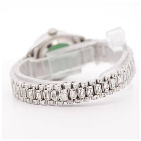 This 950 platinum Presidential bracelet features emerald cut diamonds in each link creating continuous brilliance around the wrist. The iconic three-link Presidential design provides supreme comfort and luxury while showcasing exceptional craftsmanship. Platinum construction ensures lasting durability and hypoallergenic properties. The integrated bracelet design eliminates visible lugs for seamless flow from case to bracelet.