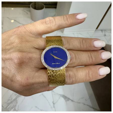 Lady's 18K yellow gold diamond and lapis lazuli PIAGET Ellipse Swiss-made wristwatch. Engraved with "NEIMAN MARCUS" and "18K". The "PIAGET " trademark (or hallmark) can also be found on the item.