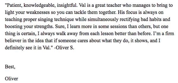 "I have worked with other vocal coaches and no one is as effective as Val. And in such a short time too. With Val's multiple talents, teaching technique, and intuition, he not only helped me musically but he also helped me build the confidence I needed to be the singer he knew I could be."