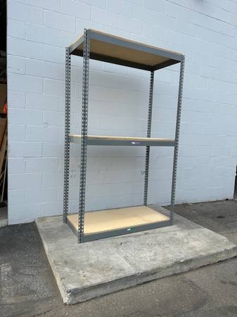 Used heavy duty boltless American made industrial shelving 48 in W x 24 in D x 84 in H with 3 shelf levels. Ready for pickup. Delivery and assembly available. (72 inch height, and additional shelf levels available.)