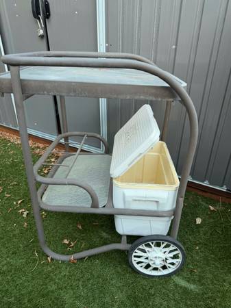Brown & Jordan Tea Cart A little weathered But in good condition except for small crack In cooler. Needs waxing of buffing of repaint, but glass is good. Its in solid shape. Wheels are good.