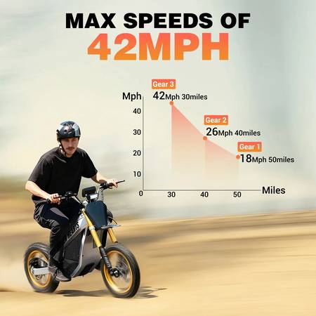 2000W High Performance Motor: HOVERHEART Electric Dirt Bike, equipped with a 3000W motor and a 36V battery and featuring wear-resistant wheels for stable rides on various terrains, reaches speeds up to 42 mph and supports up to 225 pounds.