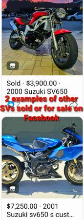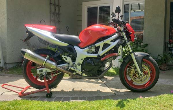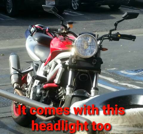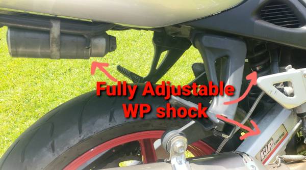 Front Carbon Fiber fender is from a Ducati 888. Passenger seat cowling was the last one available from Suzuki as a OEM Suzuki Racing accessory. Same for those little triangular plates that fill up the gap left by the removed passenger grab handle. A "street fighter" headlight and headlight housing is now installed on the bike but a round one like shown in one picture comes with the bike. Same is for that windshield shown in a picture. Passenger seat and grab handle go with the bike too. It also has a rack that was sold by Suzuki as OEM Accessory.