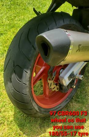 For the frame I opted for a set of forks off of a 97 Honda CBR600 F3 that have pre-load and rebound adjusters. The rear shock was replaced with a fully adjustable WP shock made for the SV650 with a remote gas reservoir. Rear wheel is still off of a 97 CBR600 F3 with customized spacers provided by Zoran for this mod. This wheel can host a 180/55-17 tyre instead of the stock 160/60-17.