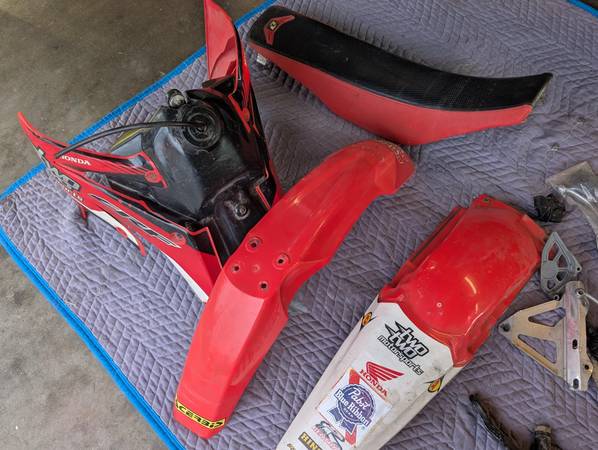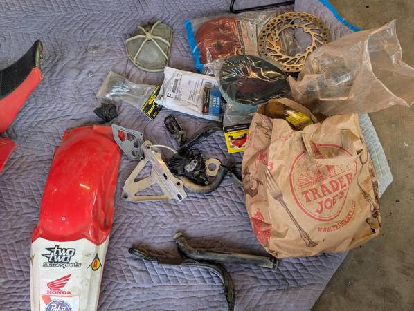 Honda 2005 CRF250 project bike. Great father-son project bike that needs some new love. Bike comes with all the parts to reassemble it, plus lots of other miscellaneous parts. Includes billet kickstand, which is over $100 by itself, still in the box. We have rebuilt the carburetor and top end (new piston and rings), and adjusted the valves, replaced all the top end gaskets, etc. Unfortunately, it doesn't currently run. That'll be up to you to resolve, but it does have spark and fuel. Just we are done spending time. Other good items:
