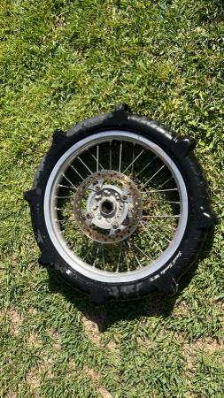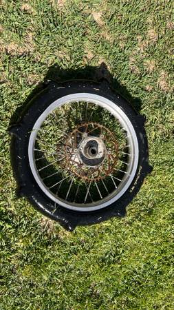Rear wheel for 2001 CR 250 with paddle tire, disc and Ironman sprocket (which is a bit rusty but otherwise in great shape).