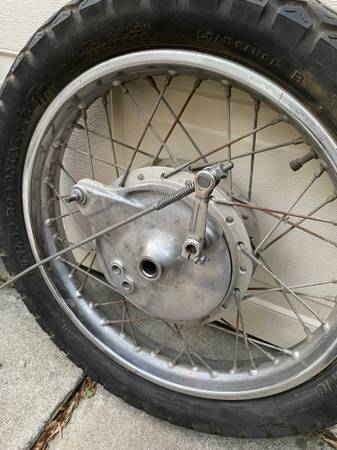 Here's a matching set of early Honda 450 wheels from the drum brake period, with Dunlop K81 TT100 tires (lots of good tread left!). Rear brake rod and axle included.