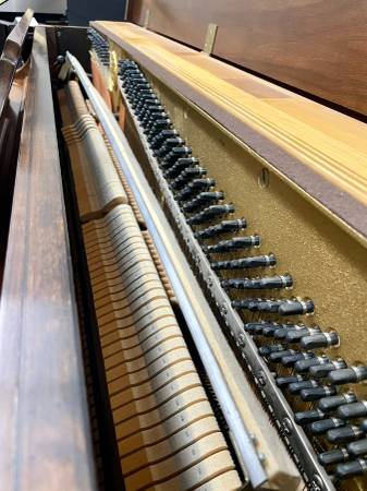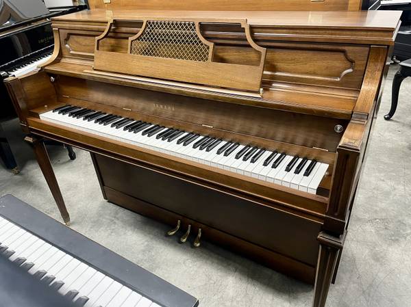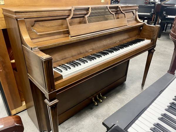 Beautiful Yamaha M204 Upright Piano. This piano features a gorgeous satin walnut finish. It has a lovely brighter tone and excellent touch. The console style is highly-popular among musicians and homeowners for its compact size and excellent sound. It features lovely square fluted-style legs. This is an excellent deal on an excellent Yamaha console piano!