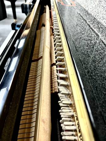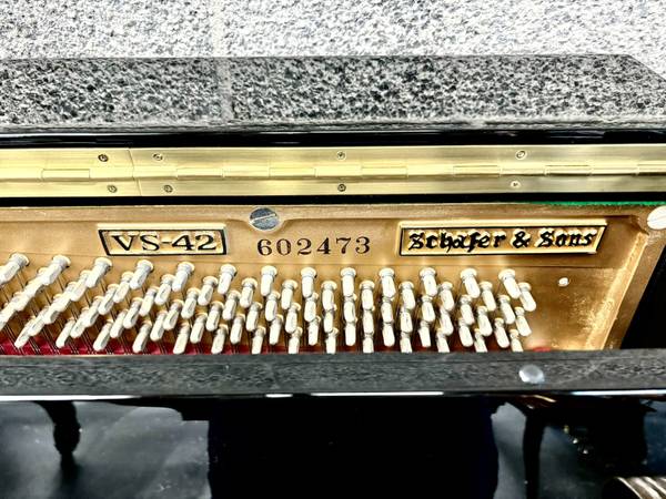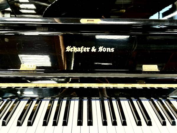 Beautiful Schafer & Sons VS-42 Console Upright Piano. This piano features a gorgeous polished ebony finish. It has a lovely brighter tone and excellent touch. The console size is highly-popular for students and homeowners for its compact size and excellent sound. The continental style is highly sought-after for its legless and compact design, fitting excellent in smaler homes and spaces.