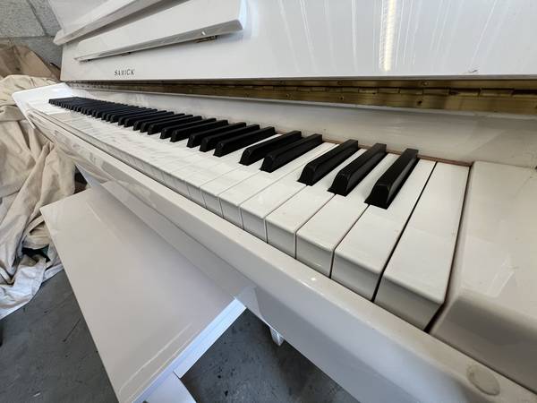 High Gloss White Samick Full Studio Upright Piano with Matching Bench in Excellent Mechanical Condition! This piano has an Amazing Tone, Plays Wonderfully and Sounds Beautiful! The Case looks Great, has very minor wear and The Piano Looks, Plays and Sounds Amazing!