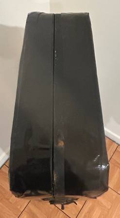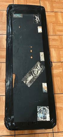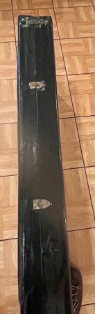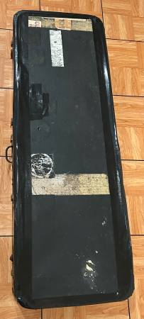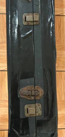 There are rips, damages, etc. to the yellow interior in certain areas including a heavy wear down to the wood where one of the Banjo pegs contacted. Interior will also require some glue in certain areas as well. Three of the latches have been replaced (one still original and working) and handle has also been replaced. Superior quality black duct tape has been applied for reinforcement and extra protection. Original nterior neck rest is present (loose) and needs to be re-attached. There are also many stickers/decals applied that can probably be removed.