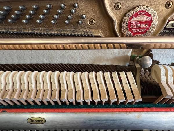 This Beautiful Schimmel Upright Piano is in Great Mechanical Condition and - TONE ALERT! MUSICIANS, PRODUCERS AND COMPOSERS - WE ARE ALWAYS LOOKING OUT FOR PIANOS WITH AMAZING TONE AND "THAT SOUND" AND THIS PIANO HAS AN AWESOME TONE! Schimmel is one of the Great European Piano makers and we rarely see these pianos come into our shop. And while most Schimmel pianos start at around $10,000+ - we are offering the piano at a price point that is a fraction of the price of most Schimmel and European Pianos out there! The Piano has a Beautiful Walnut Wood Grain Finish in Good Condition with some wear to it, The Piano has the famous Renner action which gives it it's delicate touch and nice bounce and feel and comes with a built-in Mute Rail designed to reduce the volume of the instrument for after hours playing, but these pianos have been in-demand for Composers, Producers and Musicians looking for that beautiful one of a kind hushed sound for their film scores, production and compositions. The Piano is in Great Mechanical Condition and Looks, Plays and Feels Amazing! A Classic European Piano made by Schimmel at an unbeatable price point! Made In Germany!