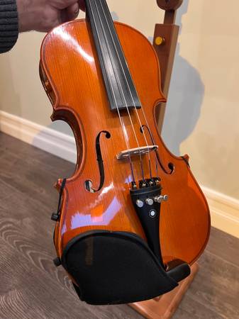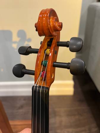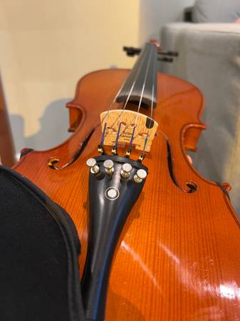 This violin has been gently used, properly cared for, and recently inspected for sound quality and playability. It produces a balanced, smooth tone across all strings and tunes easily with stable pegs and fine tuners.