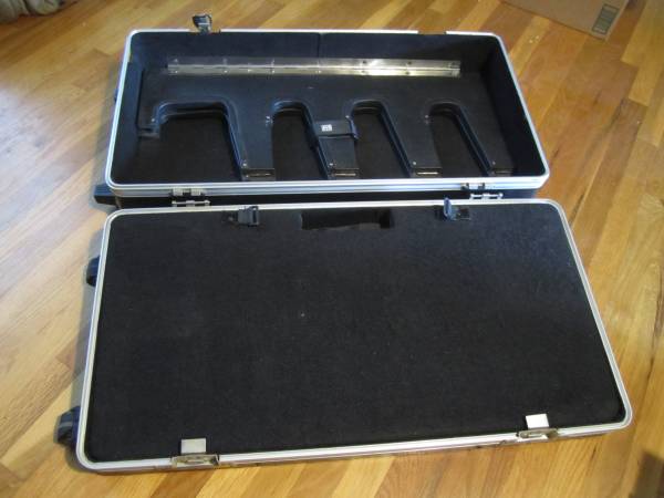 Rugged polyethylene ATA case doubles as a guitar stand and pedal board. The lid converts to hold 3 electric and one acoustic guitar. The base has a removable 29-1/2" x 15-1/2" pedal board. The Gator Gig Box has a carpet-lined interior and comes with Velcro to hold your effect pedals in place. The recessed, chromeplated, lockable twist latches; recessed wheels; and tow handle make this pedal board case and guitar stand unit an easy solution for any mobile musician. 32"L x 19"W x 9"D. 16 lbs.