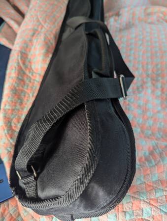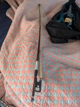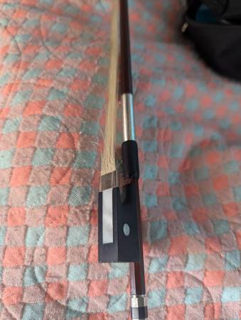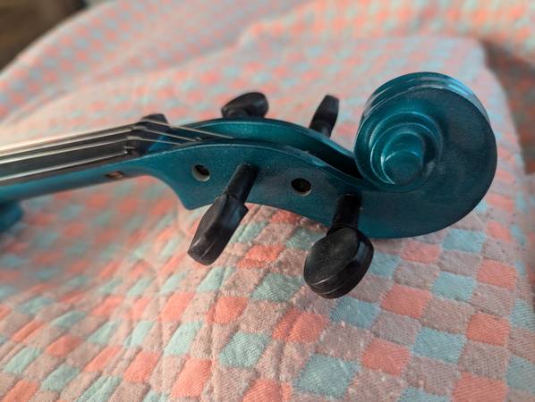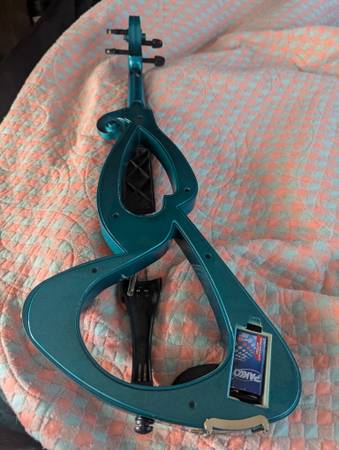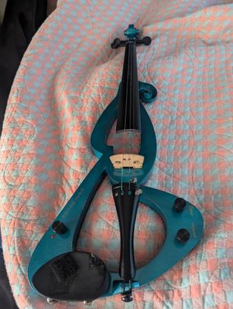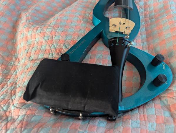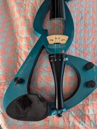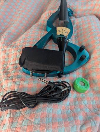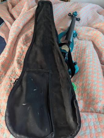 Sojing electric violin with bow, case, cord, rosin, good condition. One string missing, the bow needs restringing, no battery cover.
