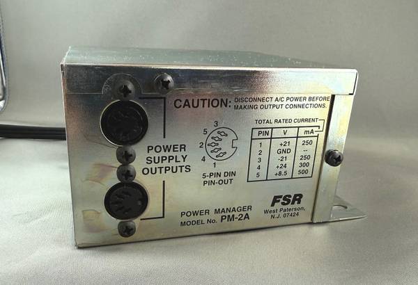 Up for sale is a USED POWER SUPPLY, FSR MODEL PM-2A POWER MANAGER WITH SELECTABLE OUTPUT LEVELS, 250 to 500mA. This unit was removed from a function audio rack installed in a restaurant that shut down. This device uses a 5-PIN DIN Connector that can be configured for either 250mA, 300mA and 500mA. MADE IN USA! Asking $15.00