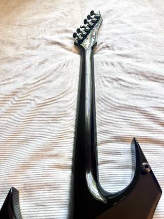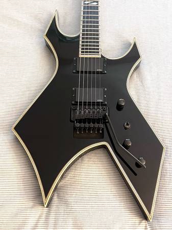 B.C. Rich Warlock NJ Deluxe in Onyx Black gloss finish with pearl binding. Ebony fretboard with 24 jumbo frets. EMG 81/85 active pickups, original Floyd Rose tremolo, and Grover inline 6 tuners on a reverse headstock. All black hardware. black coffin case with red interior (keys included.)