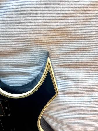 This guitar had been very well kept. Looks stunning, plays super easily (recently setup), and sounds extremely brutal! Only has a few minor cosmetic flaws (pictured and marked with red circles) that do not affect playability. one of the bottom horns on the back of the guitar had a small chip that has been repaired with black paint, in the control cavity one of the wood pieces that the screw would go into is chipped so one of the screws does not secure in, and the black plastic pickup rings have cracks in them which can be easily replaced for a few dollars. Overall in beautiful condition!