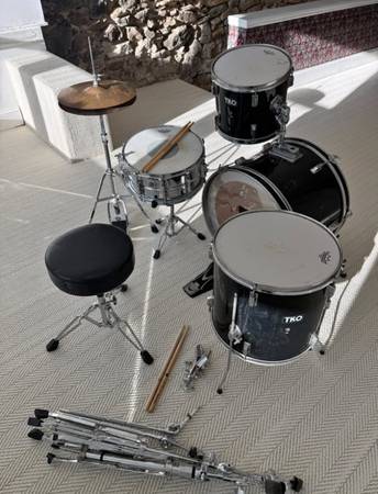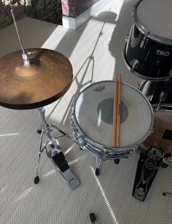 Great drum set for beginner. Zildjian ZBT hi-hats, Yamaha Stage Custom Steel Snare, TKO shells, and extra stands. Sticks included!