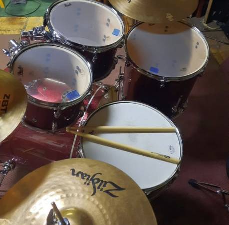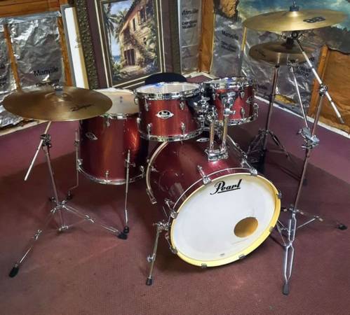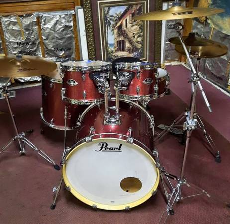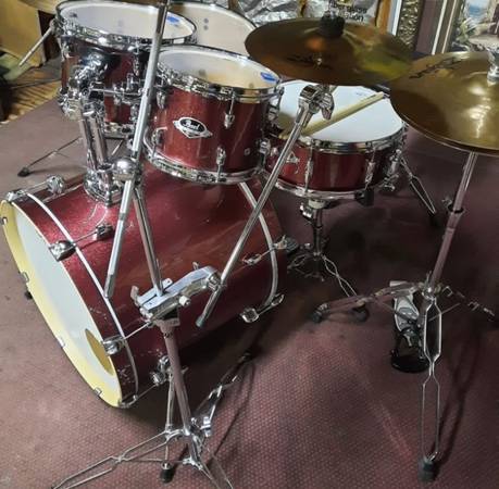 This is a modern Pearl Export kit that is in like new condition. It's in a cool color that's called "Black Cherry Glitter". I don't think Pearl made the Export in this color for very long.....you usually see newer Exports in Wine Red or Burgundy, but this color sparkles under the lights with a lot of red & black metallic in it. I looked at a bunch of old Pearl catalogs online, and I've only seen this color listed for the Export in one of their 2023 catalogs, so Idk if that was the only year or what... This color seems to have been used primarily on Pearl's Midtown kit.