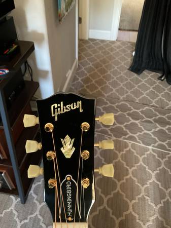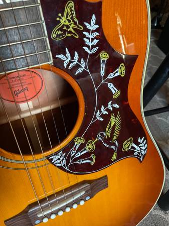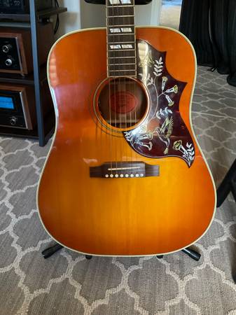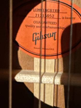 Just in time for the holidays! Exceptional 2015 Gibson Hummingbird! Not a scratch or mark to be found - honestly. The pick guard is perfect. The vintage style tuners (Klusons?) work effortlessly. Plays easy and comfortably like you'd want your Hummingbird to do. This Bird comes in the honey burst color and is the only one I’m aware of that has "HUMMINGBIRD" engraved in the truss rod cover. Sweet! It is patterned after the 1960’s Hummingbirds. How's it play? Once you own a Bird you quite literally do not need another acoustic guitar. With deep rich lows and sparkling mids, this immaculate beauty sings. And that 10 year aged wood! Wow. Better than new! This one comes with factory, installed electronics and pick up too. Talk about rare and this one is literally perfect. Honey Burst!, Golden nectar! Comes with a non original hard shell case. More pics upon request.