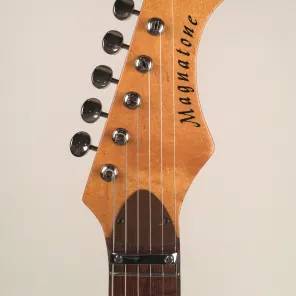 The Magnatone X-15 Tornado was an American made solid body electric guitar, introduced in 1965. Double cut-away ultra sleek hand contoured body, which is light in weight and precision balanced for comfortable playing. Features the “Lever-Lock" vibrato and the fastest playing smooth action neck. Specially designed adjustable "rocker" bridge avoids string breakage. 2 super-sensitive magnetic pick-ups for greater tonal variations. Strings can be self-adjusted both front and rear for more balanced sound. Exclusive preset "TILT-NECK" readjusts neck angle without removing neck from body. Another Magnatone exclusive feature the special string "NUT" prevents strings from jumping. 2 slide switches produce different rhythm and lead combinations. Lead/Rhythm switch then selects one of 8 different sounds, further modified by tone control and separate Lead & Rhythm volume controls. Appalachian fine grained poplar bodies, Northwest Canadian maple necks, imported rosewood fingerboards. All critical metal parts, including screws were made of fine highly polished stainless steel or aluminum, eliminating possible corrosion pitting or rusting. Bodies were hand, rubbed, seven coat processed lacquer (Magnatone exclusive), carefully worked to resist checking due to abrupt temperature changes.