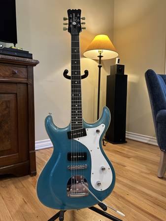 Like new, absolute mint condition, Mosrite-style Eastwood Sidejack Deluxe with Metallic Blue Finish. Superb tone from Eastwood Vintage P-90 pickups. PRO roller bridge, and Fender Jazzmaster-style...