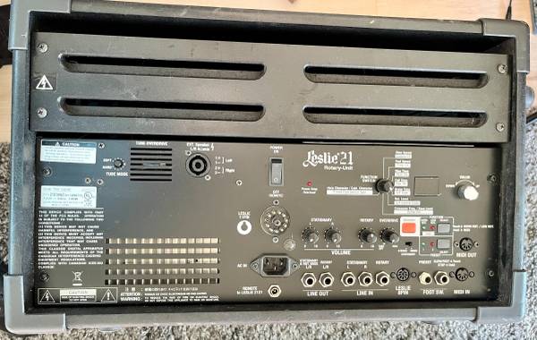 The stationary left and right channels accommodate signals from another sound source such as a synthesizer or external sound module and utilize the same two 5" low frequency drivers along with two additional 2" soft-dome tweeters for high frequencies. There are 16 different functions for both rotors, which may be saved to two presets for instant recall via select button, foot switch, or MIDI program change messages. The amplifier's enclosure is constructed from impact-resistant MDF with a black leather-like finish.