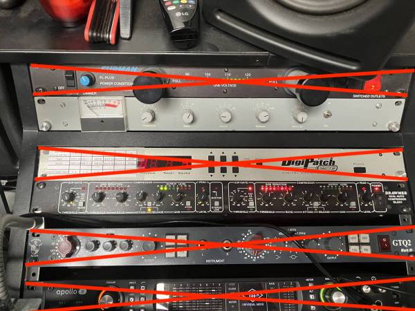 (Pictured but either sold or not for sale: UA Apollo 8+Satellite, Aurora Audio GTQ2, M-Audio DigiPatch, M-Audio Octane, Roland GI-20, Lucid GENx192, Furman Power Conditioner, Aphex Aural Exciter, Roland DEP-5, JBL M644 Gate)