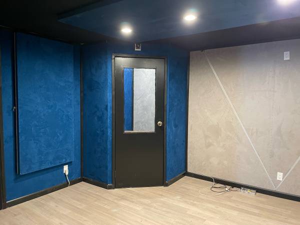 Large Celebrity Production recording, podcast, content creation space with 3 separate suites on a first floor in a 2 story building spaces with control rooms vocal booths , office , kitchenet and 3 bathrooms with shower