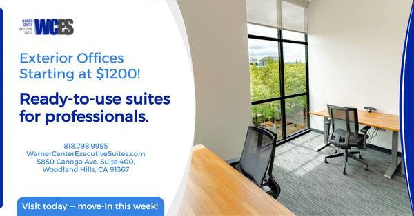 Keywords: Warner Center Executive Suites, Woodland Hills office space, private offices, team suites, executive offices, shared office space, coworking Woodland Hills, office for rent, business center, virtual office, mail service, conference room rental, meeting rooms, professional address, office near Calabasas, office near Encino, office near Tarzana, flexible lease, short-term office, long-term office, move-in ready, all-inclusive offices, receptionist services, office utilities included, free parking, business mailing address, work from home solution, small business office, startup office, therapist office, attorney office, executive suite rental, office sublease, commercial office Woodland Hills, office with windows, 24/7 access, high-speed internet, office near Warner Center, corporate office space, affordable office rent, modern office suites, Los Angeles offices, San Fernando Valley office space
