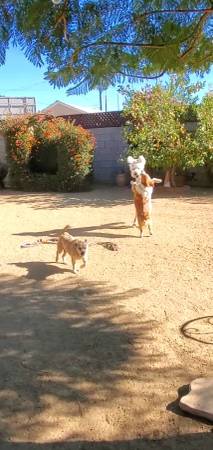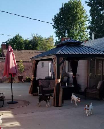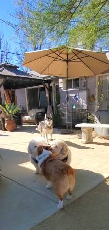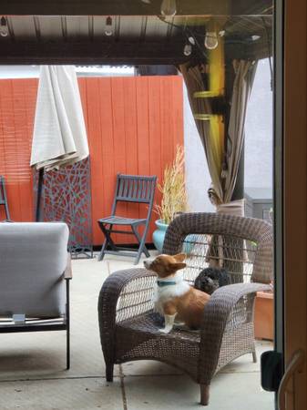 Good size fenced yard for playing and running. Comfortable patio furniture outside, and dog beds inside for relaxing and sleeping.