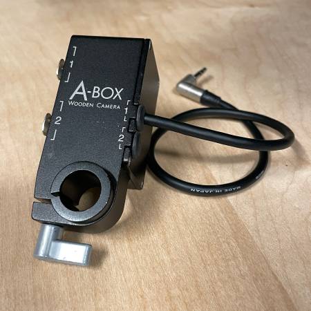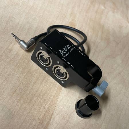 Wooden Camera A-Box XLR to stereo 3.5mm adapter. This adapter will convert 2x 3pin XLR signals into on stereo 3.5mm male plug. Perfect for use with Red Komodo, Sony FX3, or any other camera with 3.5mm mic inputs. Could also be used with non-camera related sound equipment. Built in 19mm rod clamp with collar for 15mm. (Does not supply phantom power). Local Pickup only, cash preferred.