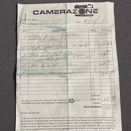 Camera purchase receipt
